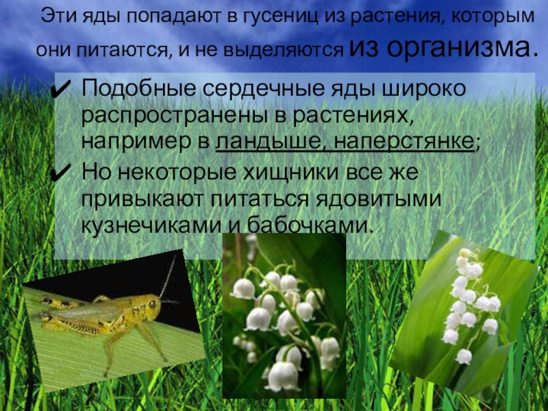 Слайд 20Эти яды попадают в гусениц из растения, которым они питаются, и