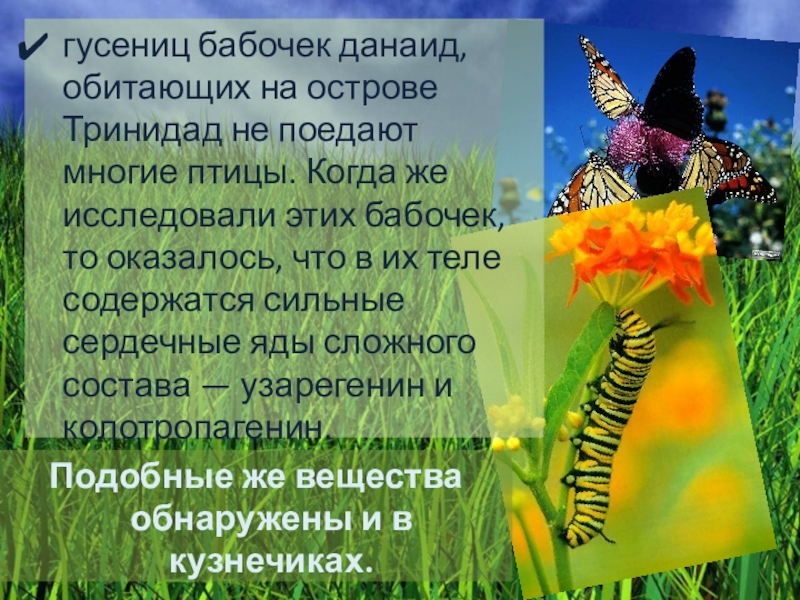 Слайд 19гусениц бабочек данаид, обитающих на острове Тринидад не поедают многие птицы.