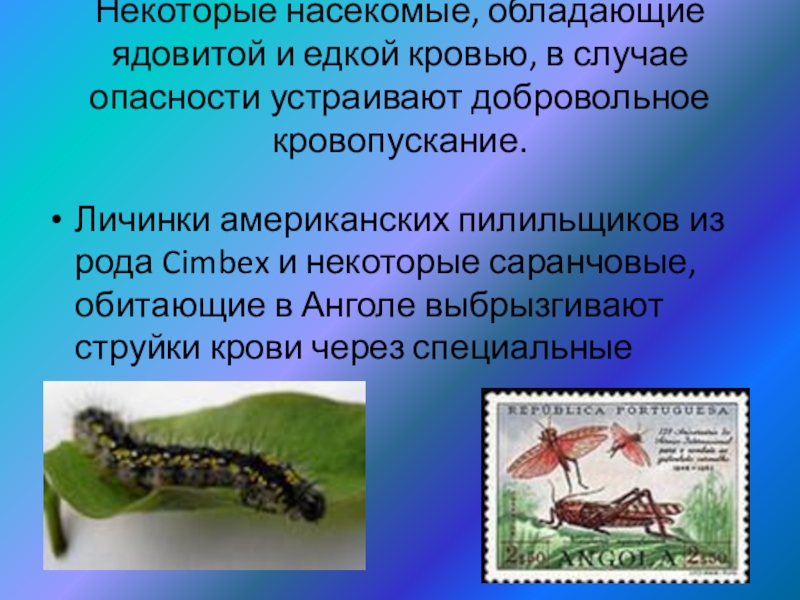 Слайд 22Некоторые насекомые, обладающие ядовитой и едкой кровью, в случае опасности устраивают