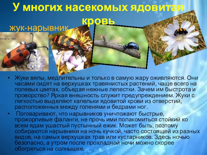 самую жару оживляются. Они часами сидят на верхушках травянистых растений, чаще всего на полевых цветах, объедая нежные лепестки. Зачем им быстрота и проворство? Яркая внешность служит предупреждением. Жуки с легкостью выделяют капельки ядовитой крови из отверстий, расположенных между голенями и бедрами ног.