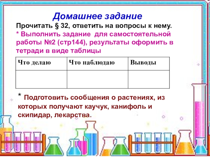 * Подготовить сообщения о растениях, из которых получают каучук, канифоль и скипидар, лекарства.