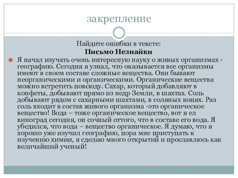 закреплениеНайдите ошибки в тексте:Письмо НезнайкиЯ начал изучать очень интересную науку о живых организмах - географию. Сегодня я
