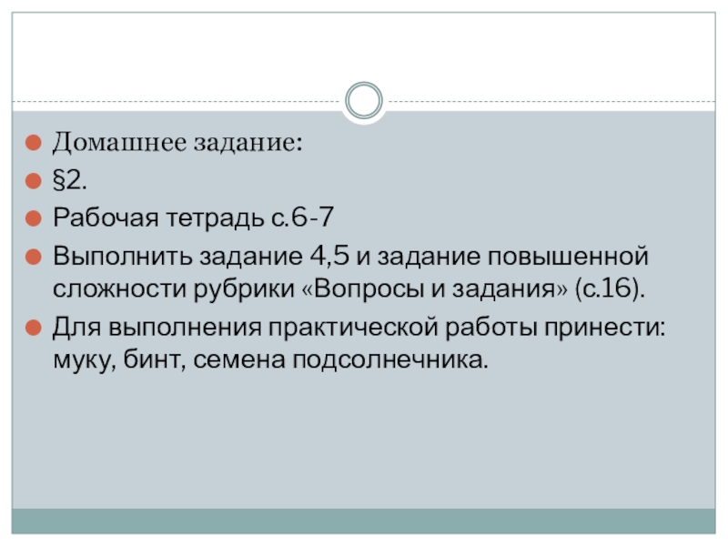 Домашнее задание:§2.Рабочая тетрадь с.6-7Выполнить задание 4,5 и задание повышенной сложности рубрики «Вопросы и задания» (с.16).Для выполнения практической