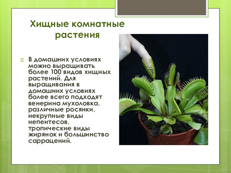 растений. Для выращивания в домашних условиях более всего подходят венерина мухоловка, различные росянки, некрупные виды непентесов, тропические виды жирянок и большинство саррацений.