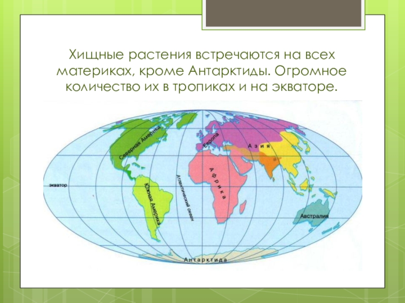 Слайд 13Хищные растения встречаются на всех материках, кроме Антарктиды. Огромное количество их