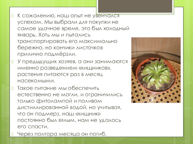Такое питание мы обеспечить естественно не могли, и ограничились только фитолампой и поливом дистиллированной водой, но учитывая, что он подмерз, наш «хищник» постоянно был вялым, нам не удалось его спасти.