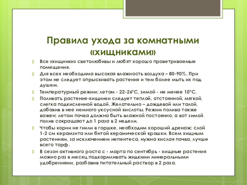 В сезон активного роста с - марта по сентябрь - хищные растения можно раз в месяц подкармливать жидкими минеральными удобрениями, разбавив питательный раствор в 2 раза.