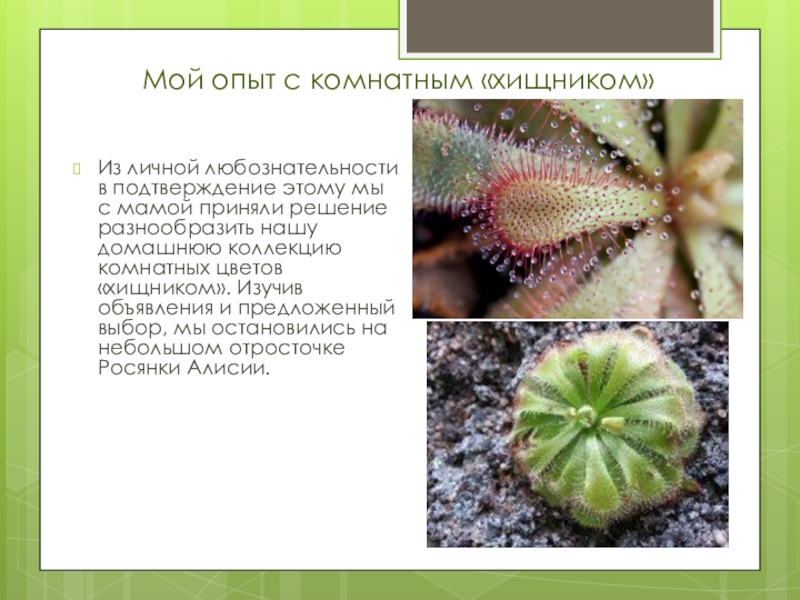 с мамой приняли решение разнообразить нашу домашнюю коллекцию комнатных цветов «хищником». Изучив объявления и предложенный выбор, мы остановились на небольшом отросточке Росянки Алисии.