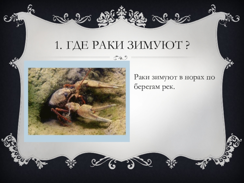 1.	Где раки зимуют ?Раки зимуют в норах по берегам рек.