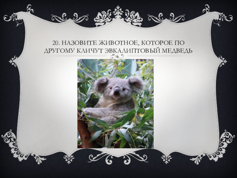 Слайд 2120. Назовите животное, которое по другому кличут эвкалиптовый медведь