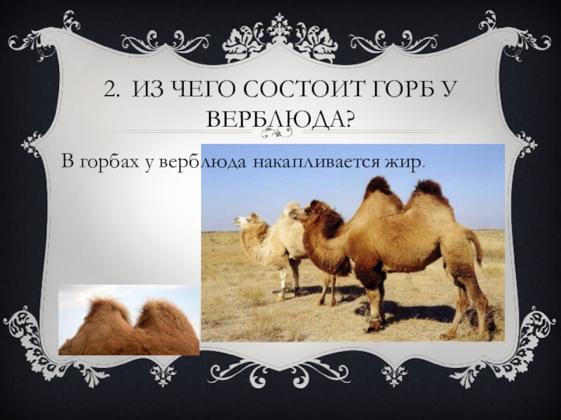 2.	Из чего состоит горб у верблюда? В горбах у верблюда накапливается жир.