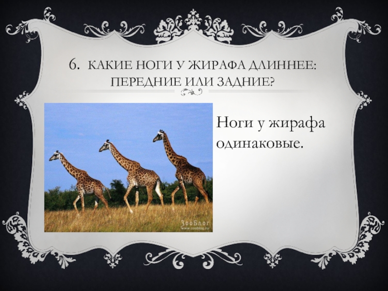 6.	Какие ноги у жирафа длиннее: передние или задние?Ноги у жирафа одинаковые.