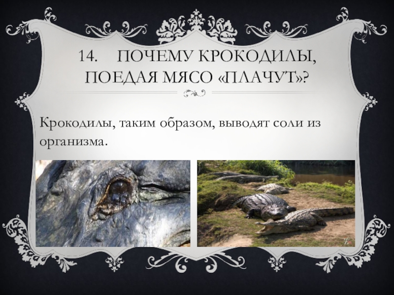 14.	Почему крокодилы, поедая мясо «ПЛАЧУТ»?Крокодилы, таким образом, выводят соли из организма.