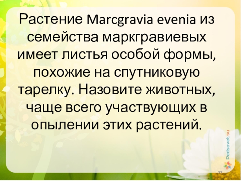 на спутниковую тарелку. Назовите животных, чаще всего участвующих в опылении этих растений.