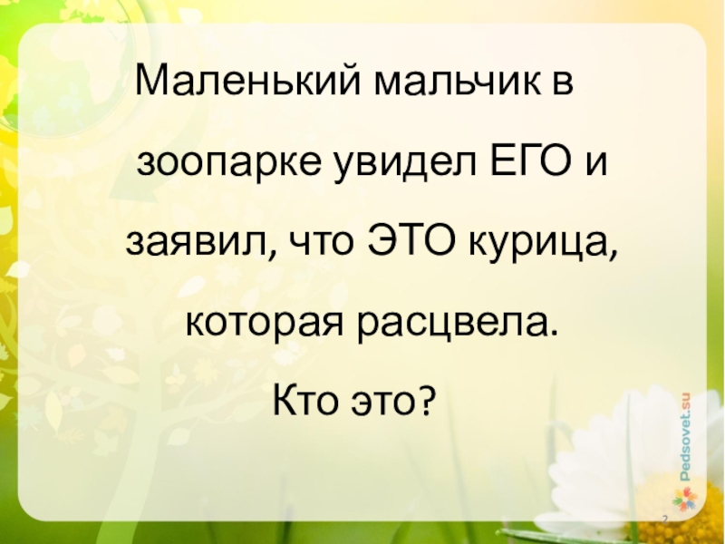Слайд 2Маленький мальчик в зоопарке увидел ЕГО и заявил, что ЭТО курица,