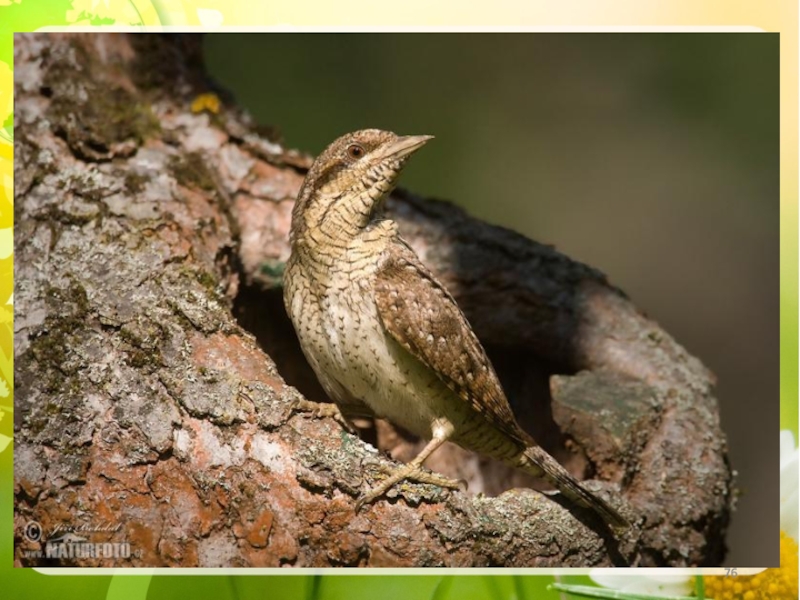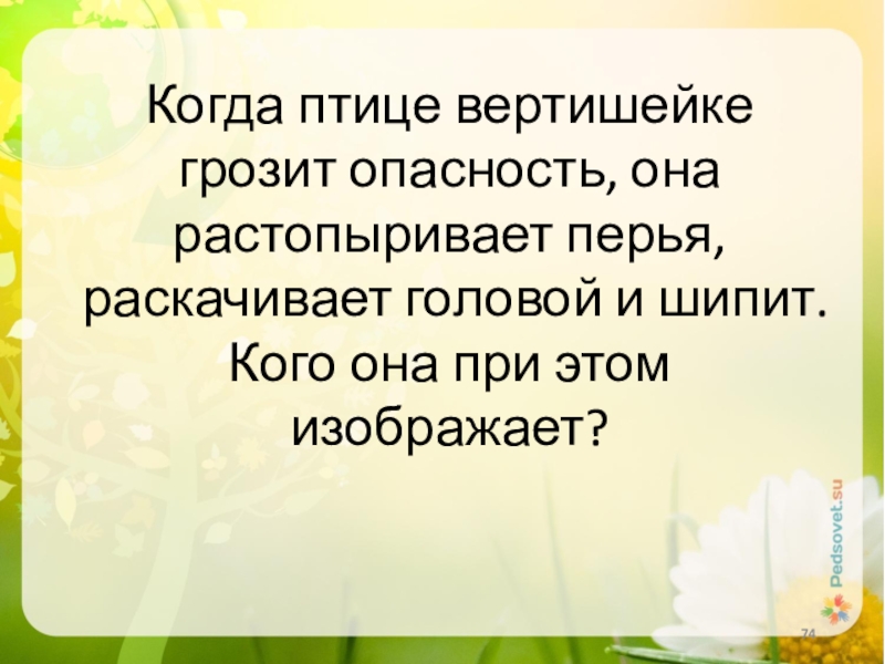 Слайд 74Когда птице вертишейке грозит опасность, она растопыривает перья, раскачивает головой и
