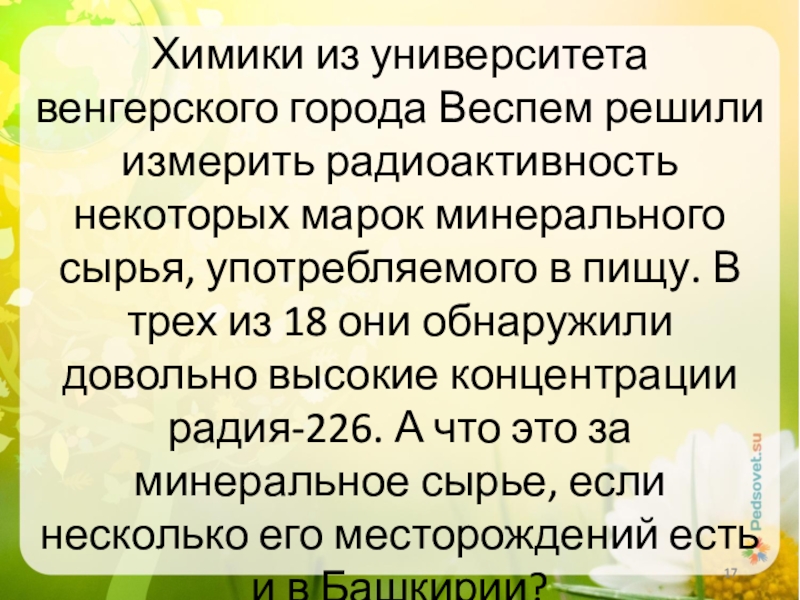 минерального сырья, употребляемого в пищу. В трех из 18 они обнаружили довольно высокие концентрации радия-226. А что это за минеральное сырье, если несколько его месторождений есть и в Башкирии?