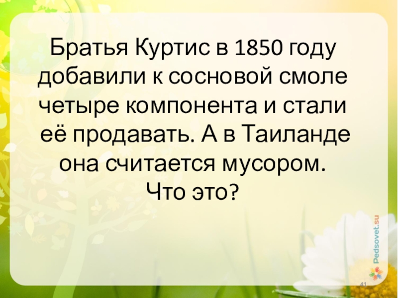 Слайд 41Братья Куртис в 1850 году добавили к сосновой смоле четыре компонента