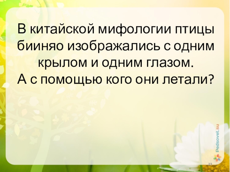 Слайд 23В китайской мифологии птицы бииняо изображались с одним крылом и одним