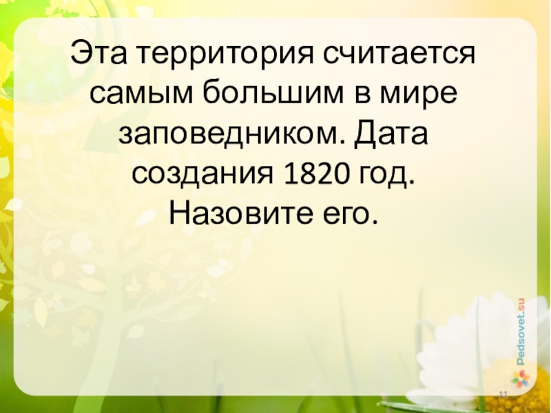 Слайд 11Эта территория считается самым большим в мире заповедником. Дата создания 1820
