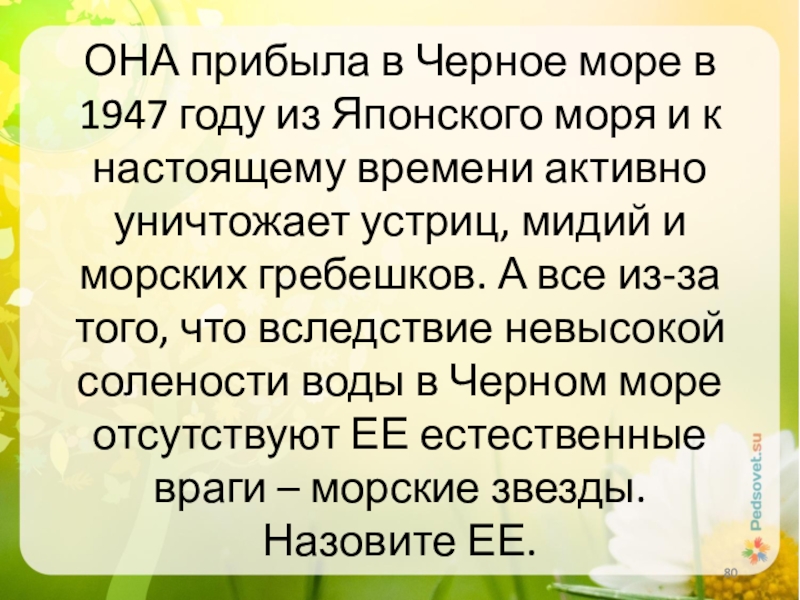 и к настоящему времени активно уничтожает устриц, мидий и морских гребешков. А все из-за того, что вследствие невысокой солености воды в Черном море отсутствуют ЕЕ естественные враги – морские звезды. Назовите ЕЕ.