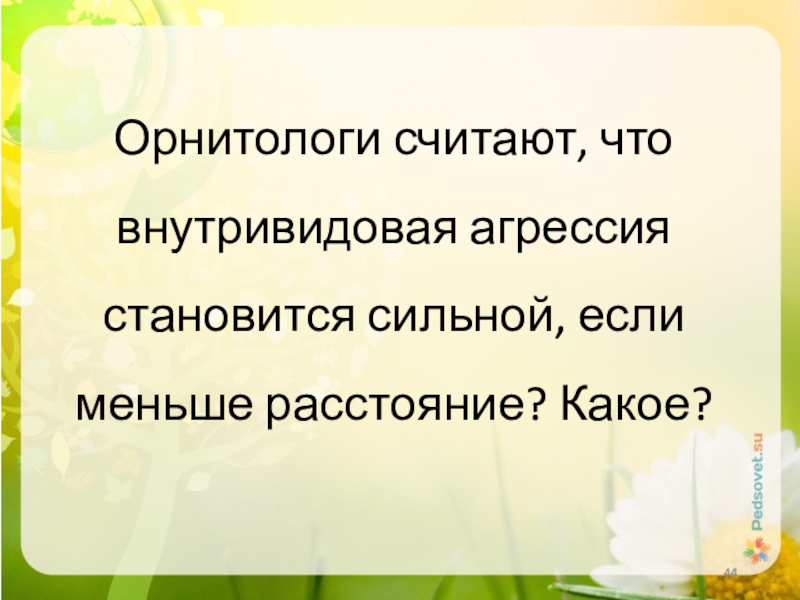 Слайд 44Орнитологи считают, что внутривидовая агрессия становится сильной, если меньше расстояние? Какое?