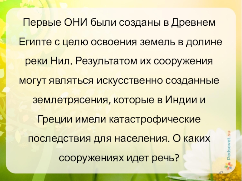 в долине реки Нил. Результатом их сооружения могут являться искусственно созданные землетрясения, которые в Индии и Греции имели катастрофические последствия для населения. О каких сооружениях идет речь?