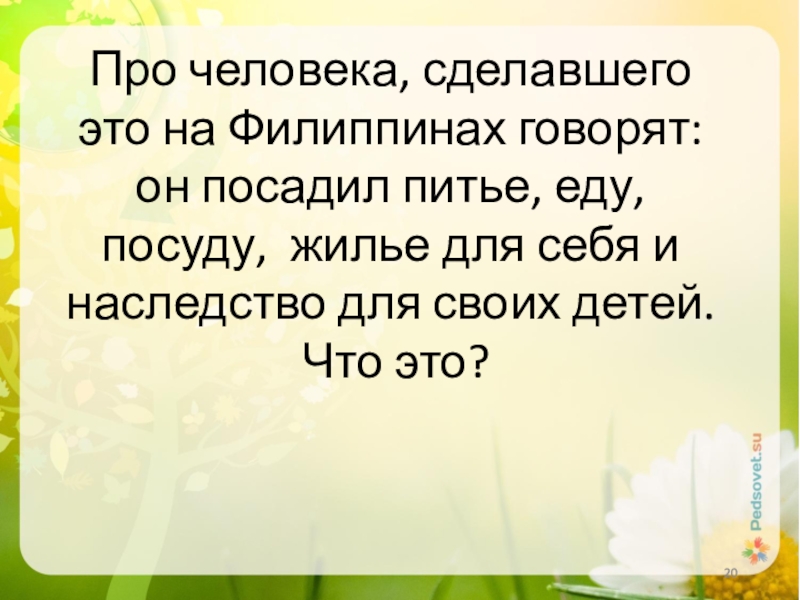 Слайд 20Про человека, сделавшего это на Филиппинах говорят: он посадил питье, еду,