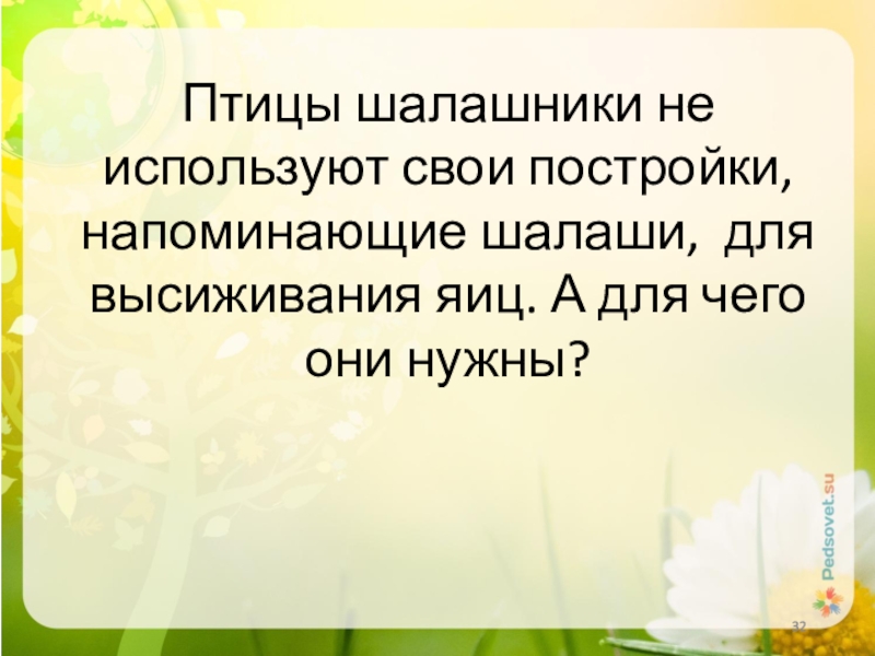Слайд 32Птицы шалашники не используют свои постройки, напоминающие шалаши, для высиживания яиц.