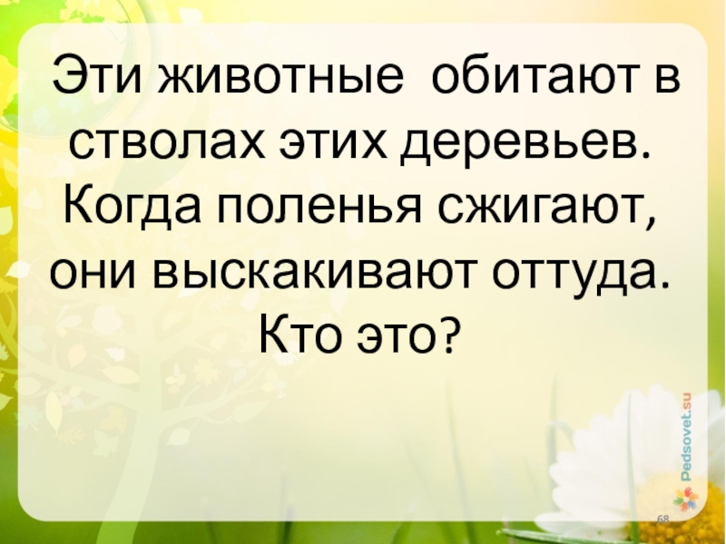 Слайд 68Эти животные обитают в стволах этих деревьев. Когда поленья сжигают, они
