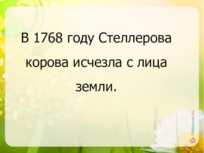 Слайд 51В 1768 году Стеллерова корова исчезла с лица земли.