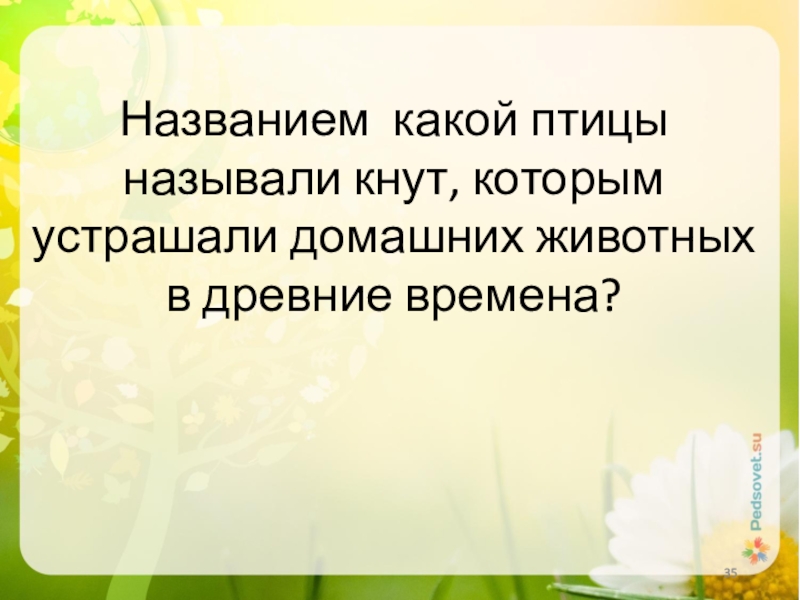 Слайд 35Названием какой птицы называли кнут, которым устрашали домашних животных в древние