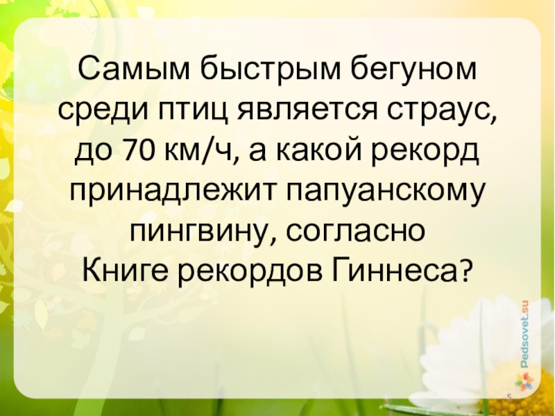 Слайд 5Самым быстрым бегуном среди птиц является страус, до 70 км/ч, а