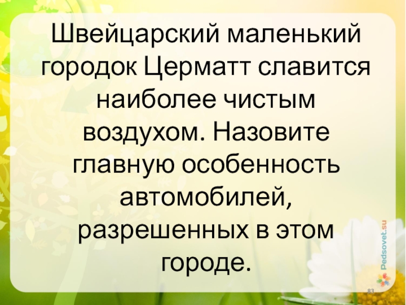 Слайд 83Швейцарский маленький городок Церматт славится наиболее чистым воздухом. Назовите главную особенность