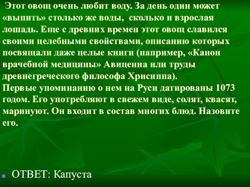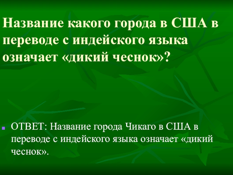 ОТВЕТ: Название города Чикаго в США в переводе с индейского языка означает «дикий чеснок».