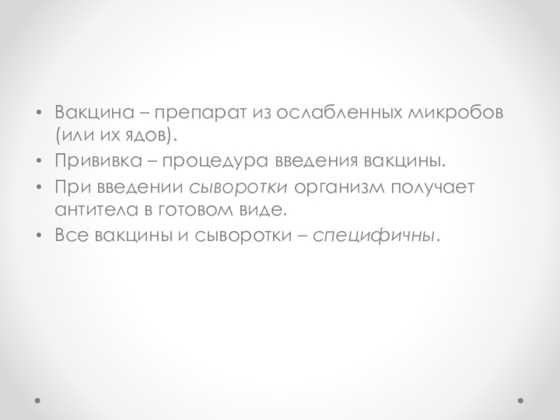 Вакцина – препарат из ослабленных микробов (или их ядов).Прививка – процедура введения вакцины.При введении сыворотки организм получает антитела в готовом виде.Все вакцины и сыворотки – специфичны.