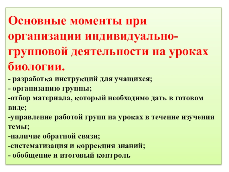 Слайд 6Основные моменты при организации индивидуально- групповой деятельности на уроках биологии. - разработка