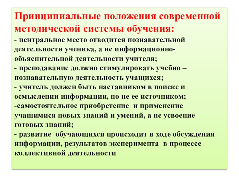 Принципиальные положения современной методической системы обучения: - центральное место отводится познавательной деятельности ученика, а не информационно-