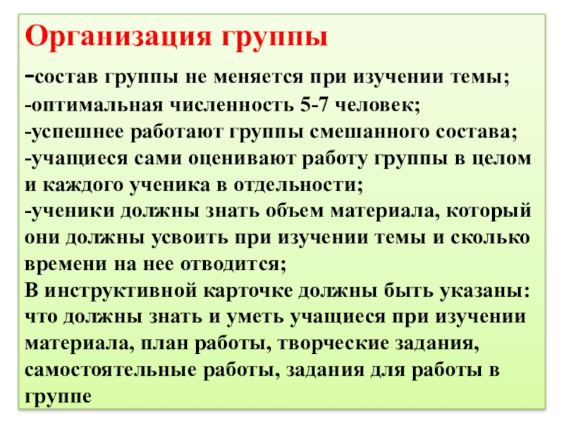 Организация группы -состав группы не меняется при изучении темы; -оптимальная численность 5-7 человек; -успешнее работают группы смешанного