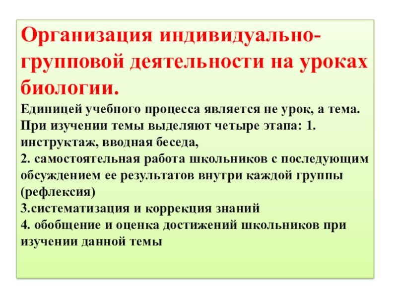 Организация индивидуально- групповой деятельности на уроках биологии. Единицей учебного процесса является не урок, а тема. При изучении