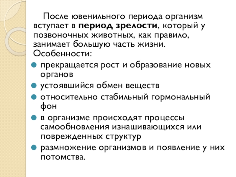 Слайд 7 После ювенильного периода организм вступает в период зрелости, который у позвоночных животных, как