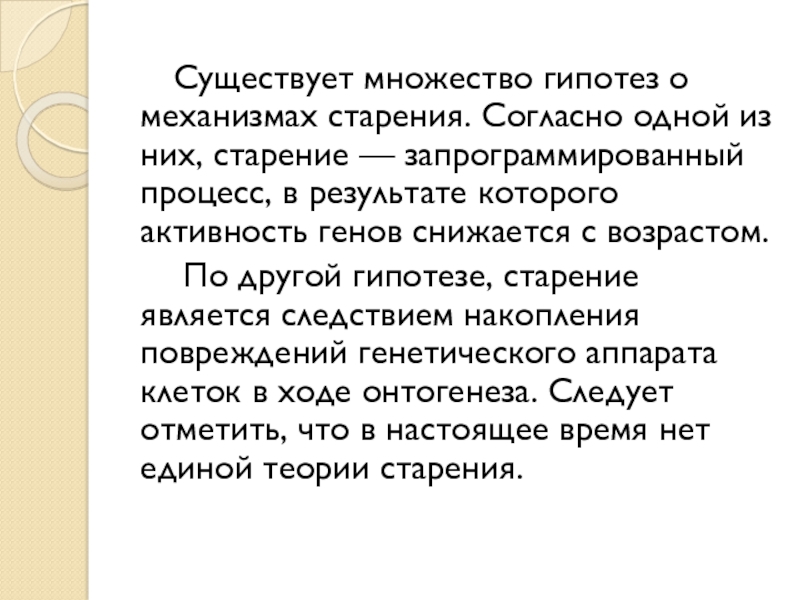 Слайд 9 Существует множество гипотез о механизмах старения. Согласно одной из них, старение