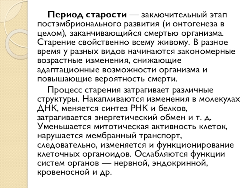 Слайд 8 Период старости — заключительный этап постэмбрионального развития (и онтогенеза в целом), заканчивающийся