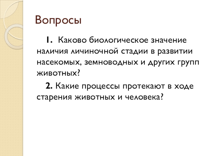 1. Каково биологическое значение наличия личиночной стадии в развитии насекомых, земноводных