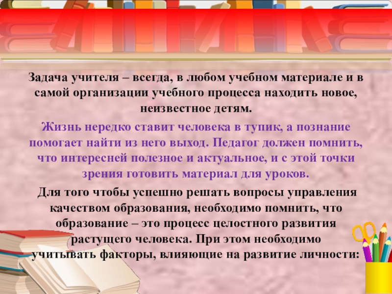 Для того чтобы успешно решать вопросы управления качеством образования, необходимо помнить, что образование – это процесс целостного развития растущего человека. При этом необходимо учитывать факторы, влияющие на развитие личности: