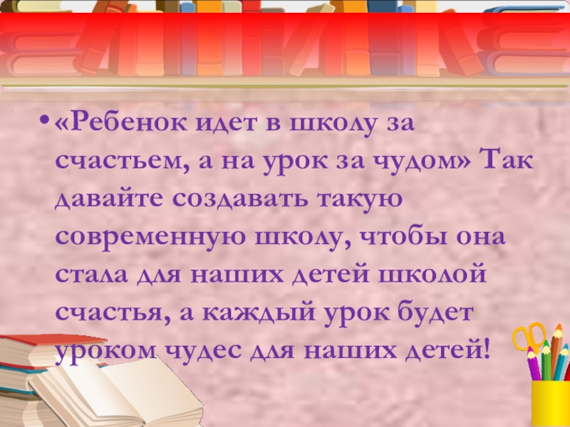 Так давайте создавать такую современную школу, чтобы она стала для наших детей школой счастья, а каждый урок будет уроком чудес для наших детей!