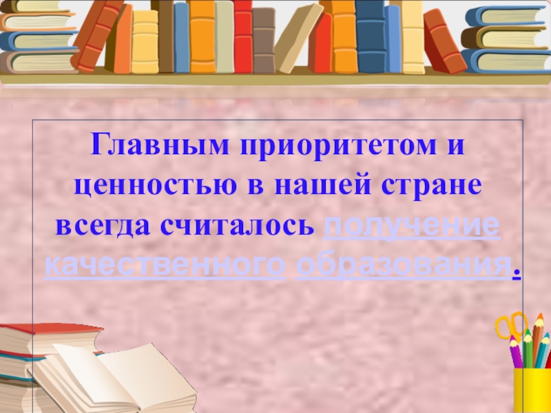Слайд 16Главным приоритетом и ценностью в нашей стране всегда считалось получение качественного образования.