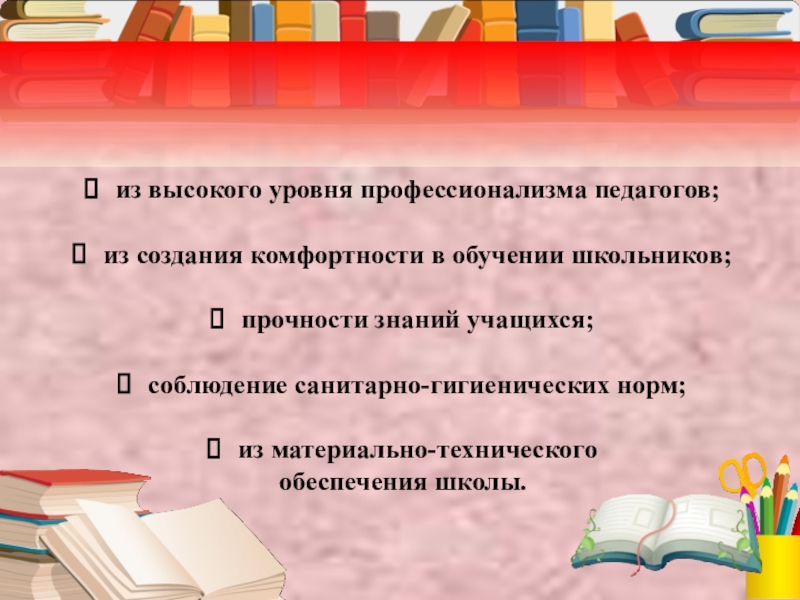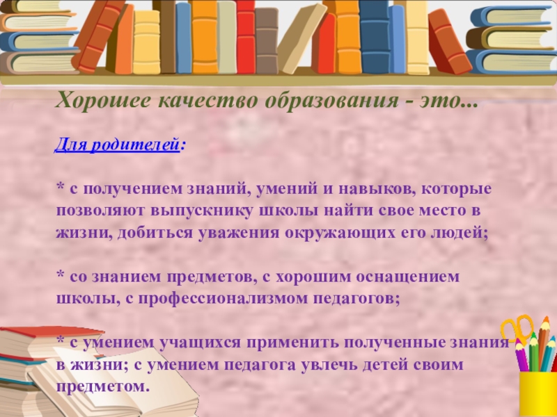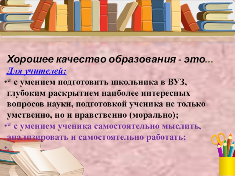 * со знанием предметов, с хорошим оснащением школы, с профессионализмом педагогов;