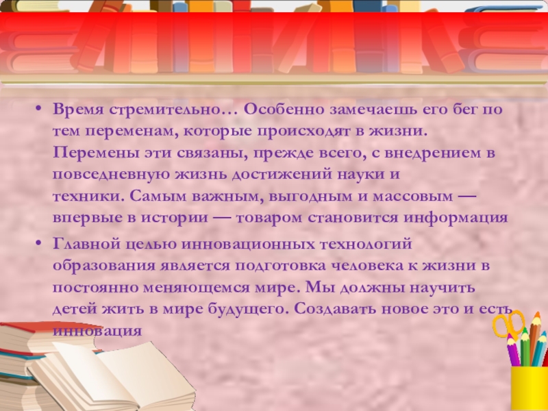 Главной целью инновационных технологий образования является подготовка человека к жизни в постоянно меняющемся мире. Мы должны научить детей жить в мире будущего. Создавать новое это и есть инновация
