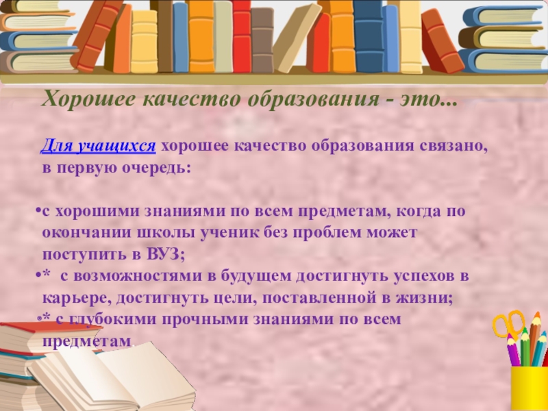 с хорошими знаниями по всем предметам, когда по окончании школы ученик без проблем может поступить в ВУЗ;